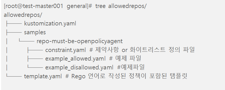 - OPA 정책에 대한 탬플릿 파일과 제약사항 정의파일 및 예제파일로 구성