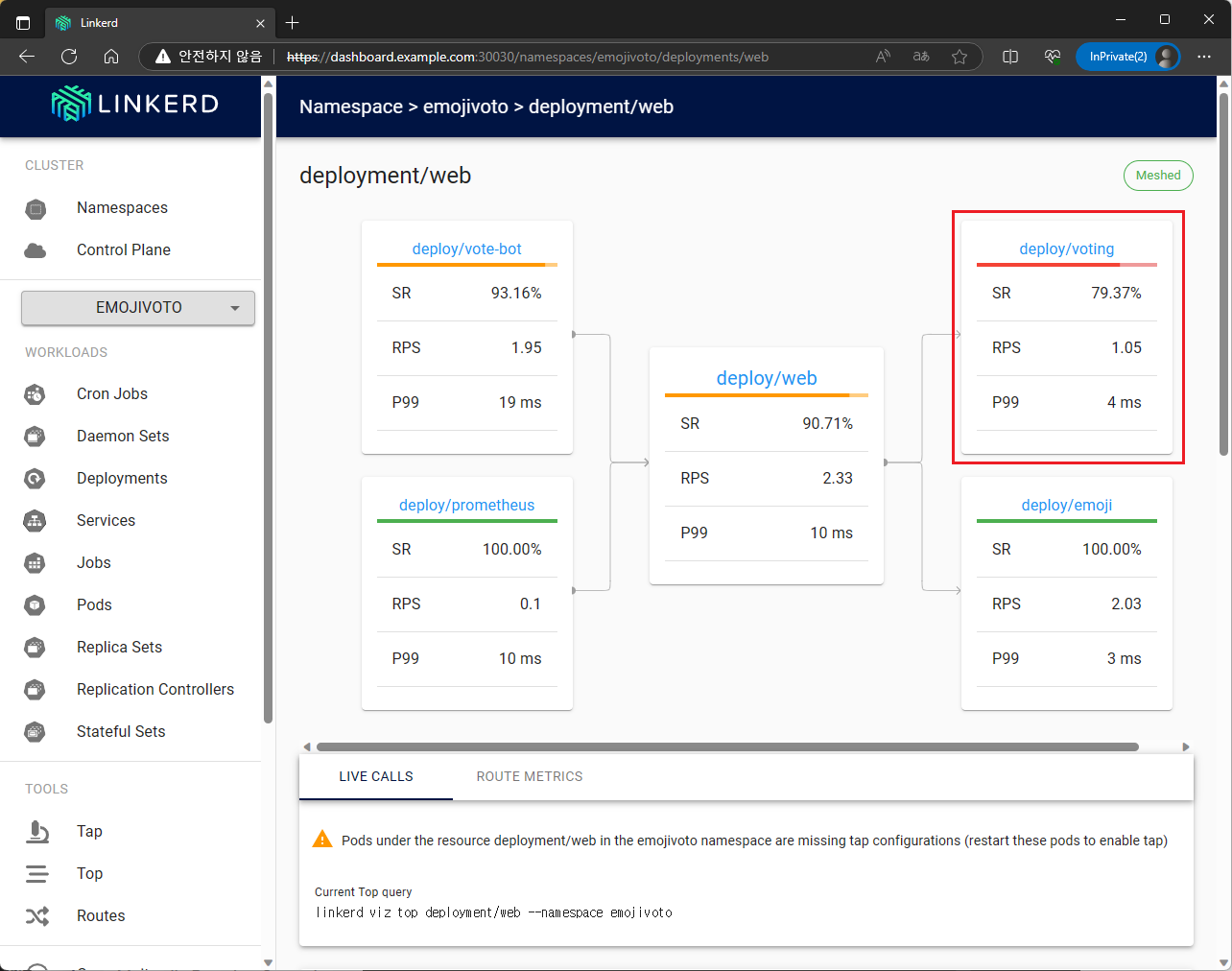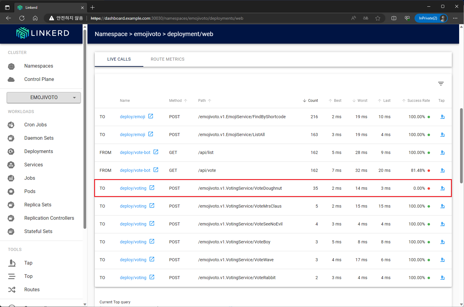 - [LIVE CALLS] 내용 중 호출 된 URL을 보면 deploy/voting 서비스로 POST 메서드로 /emojivoto.v1.VotingService/VoteDoughnut 패스를 요청하는 부분에서 Success Rate가 0인 것을 확인 할 수 있다.